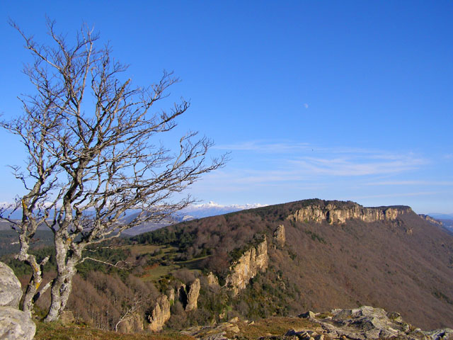 Este fin de semana hice la subida a Arangoiti por el Monasterio de Leire. El recorrido no tiene mucha perdida. Aparcando en el parking del Monasterio, se ve en una señal de trafico una marca del sendero GR-13 (Cañada de los Roncaleses) junto a un panel explicativo del mismo (la información de GR-13 está tapada por un cartel de la Federación Navarra dando cuenta de la actual descatalogación del los senderos navarros). Tomando el camino que señala la marca, se pasa por una pequeña edificación al poco tiempo de empezar andar. A partir de allí, se coge todo recto el camino en dirección a la sierra. El camino va poco a poco torciendo hacia el este. Se va progresando sin perdida acercandonos a los murallones de la sierra de Leire. En la parte final, una zona de zig-zags lleva al portillo de Leire, donde se alcanza la parte alta de la sierra.