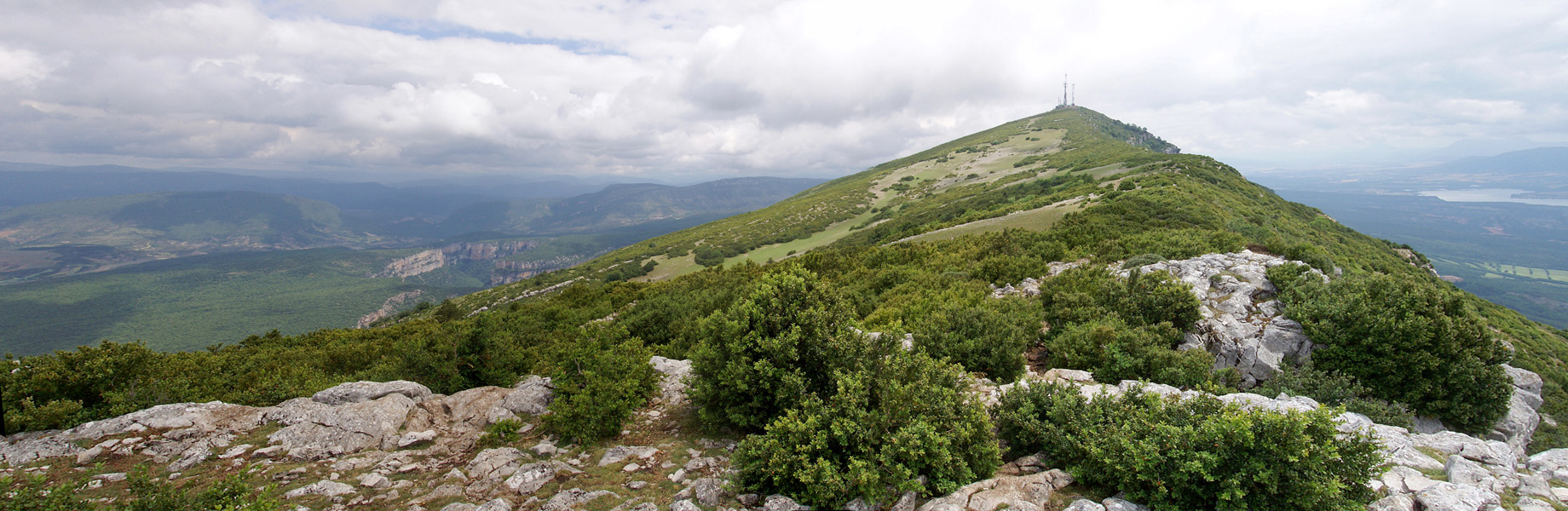 Finalmente, llegamos a un collado por donde pasan las líneas electricas de alta tensión, donde hay una torreta. Desde allí, las antenas de Arangoiti están a la vista. Sólo hay que subir hacia ellas por una zona pedregosa y se alcanza la cima sin mayor dificultad. Desde allí, entre las antenas, las vistas sobre el pantano de Yesa son espectaculares.