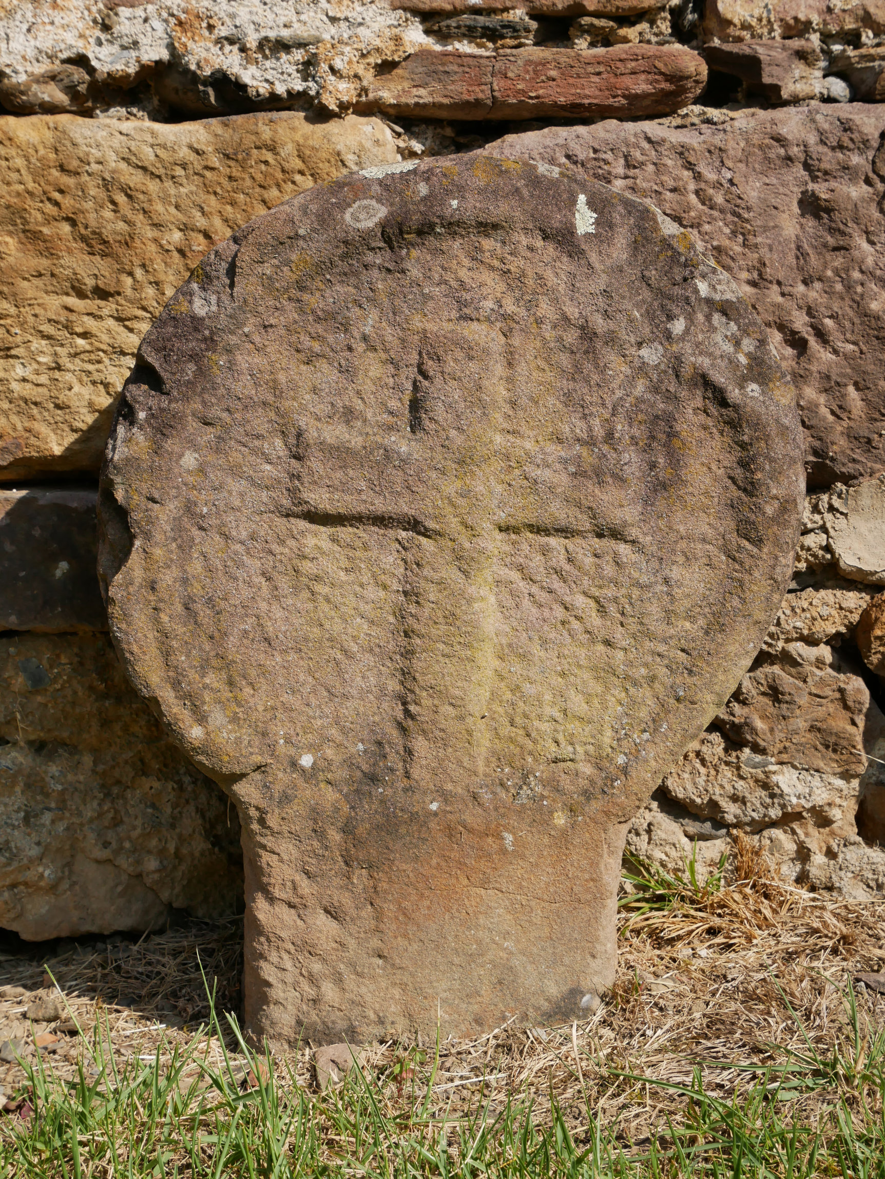 Estela discoidea con orla perimetral, de factura tosca, y en su interior cruz latina.