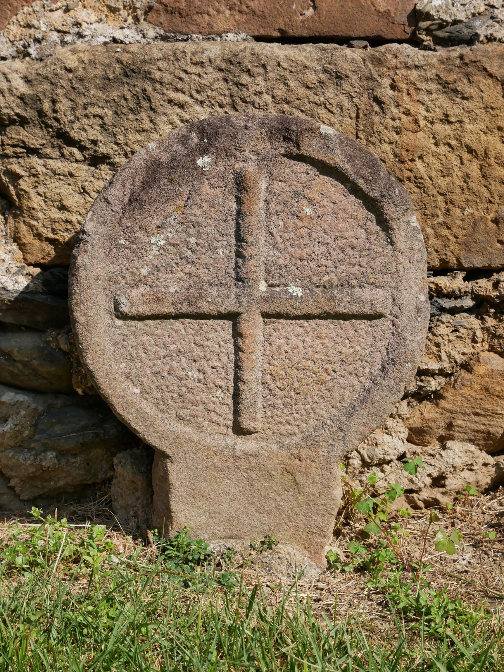 Estela discoidea con orla perimetral, de factura tosca, y en el campo cruz griega.