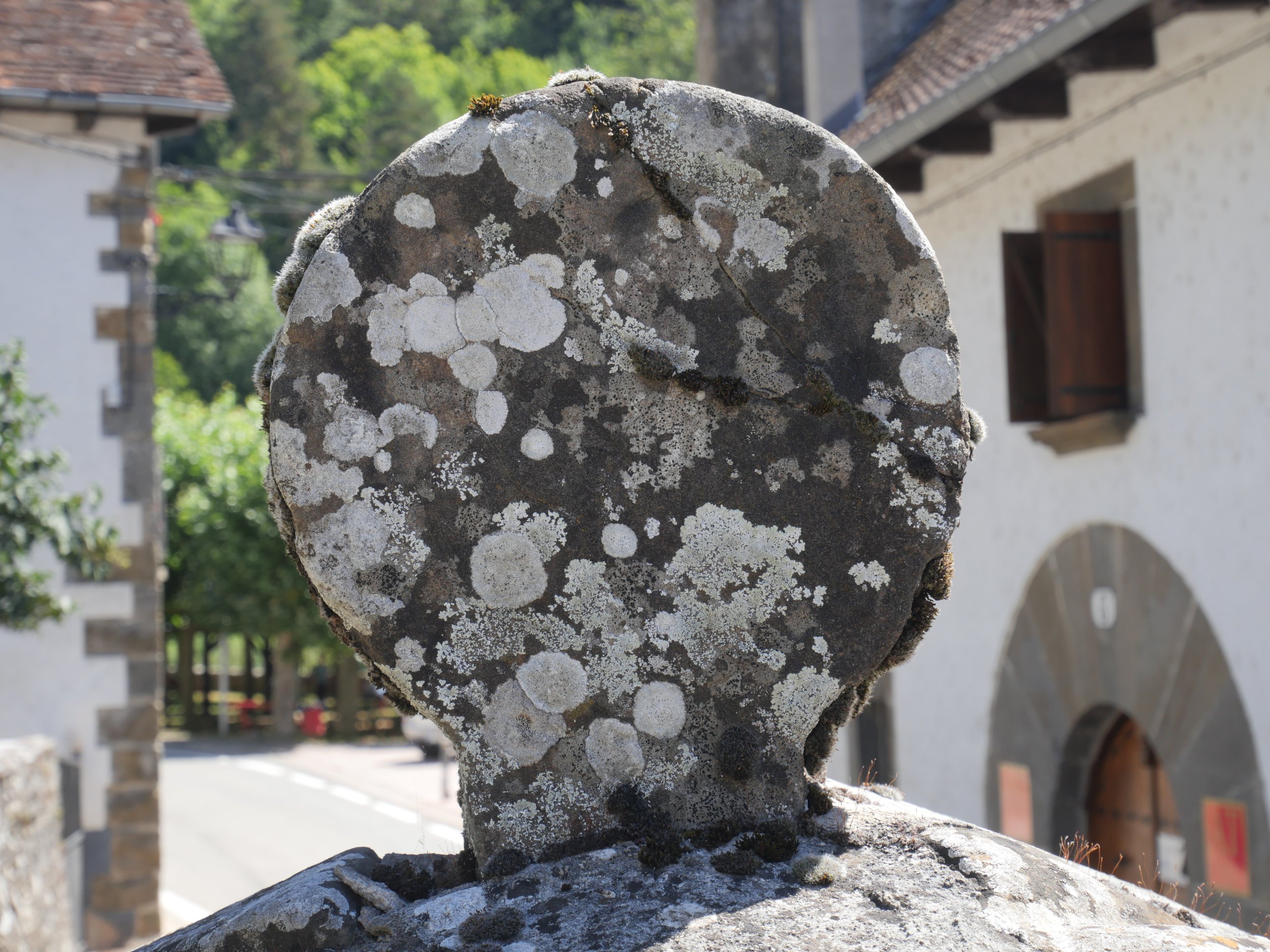 Disco incompleto de una estela discoidea de conservación deficiente. Presenta decoración en una de sus caras de roseta de seis pétalos inscrita en anillo, rodeado de seis semicírculos entrelazados.