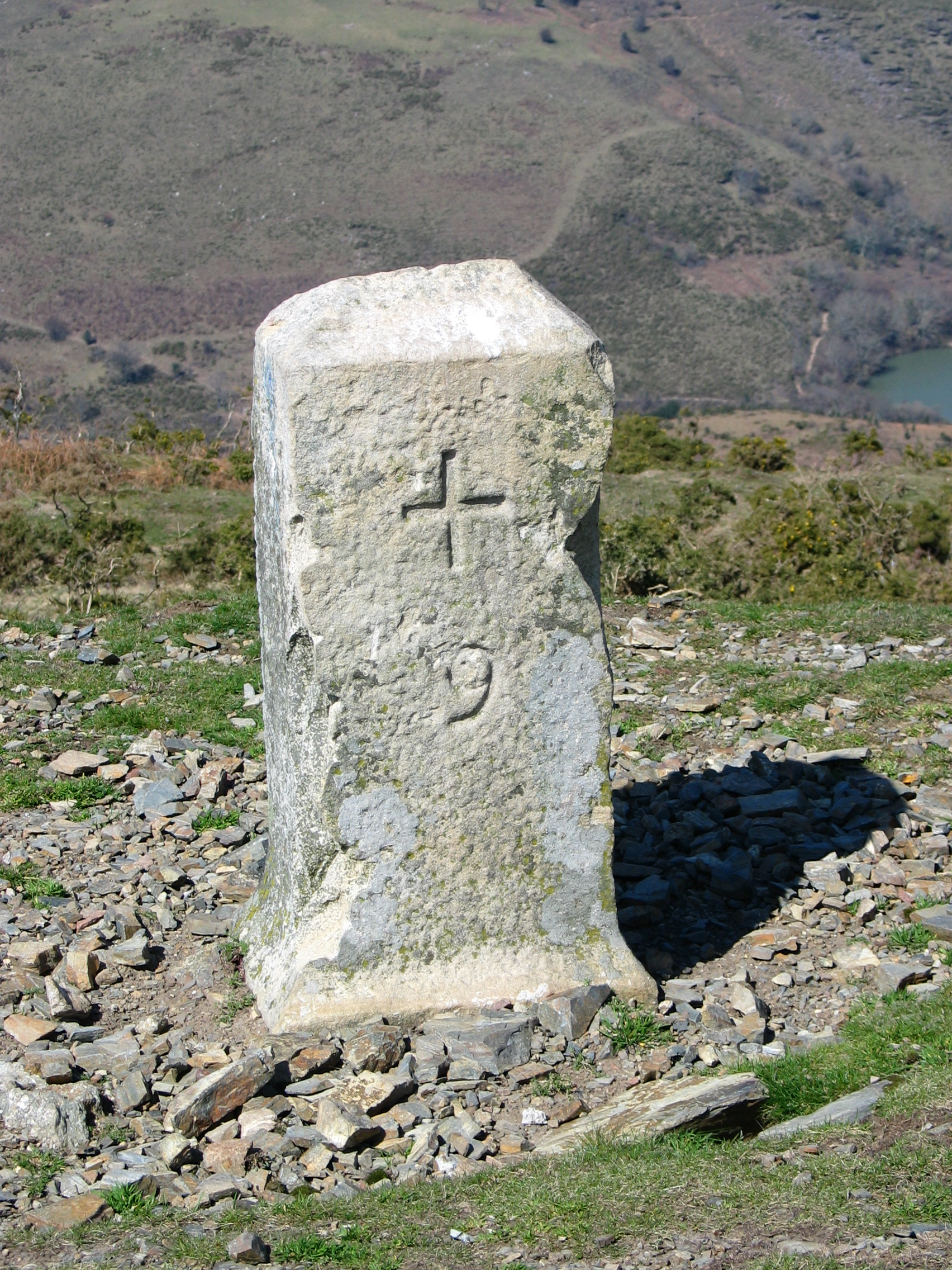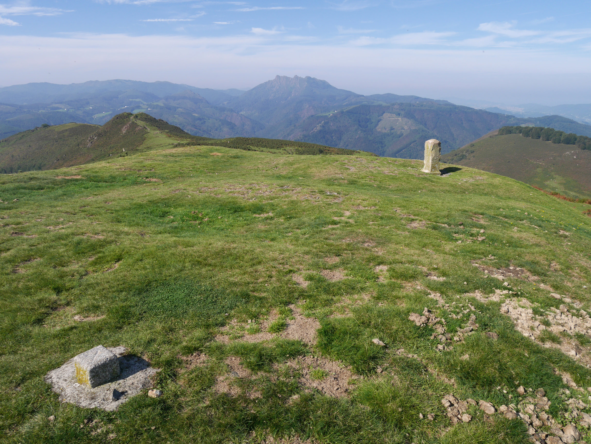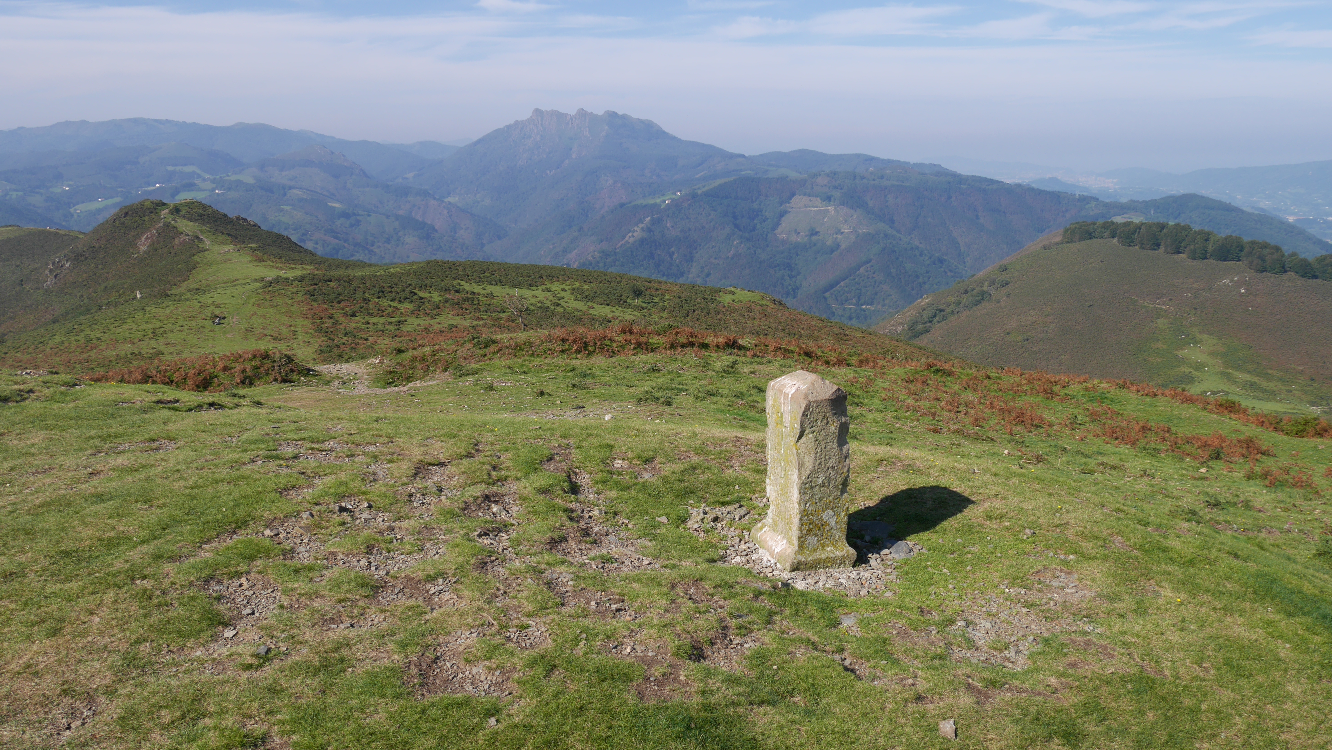 Frantzia eta Espainiaren arteko mugako bederatzigarren mugarria, Manddale mendiaren tontorrean. Orain artekoak ez bezala "R" beharrean "+" ikurrarekin lagunduta dator zenbakia. Hiru udalerriren arteko mugarria ere bada, Biriatu, Urruña eta Bera.