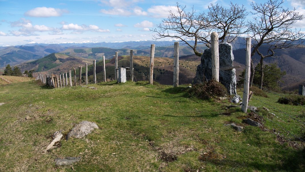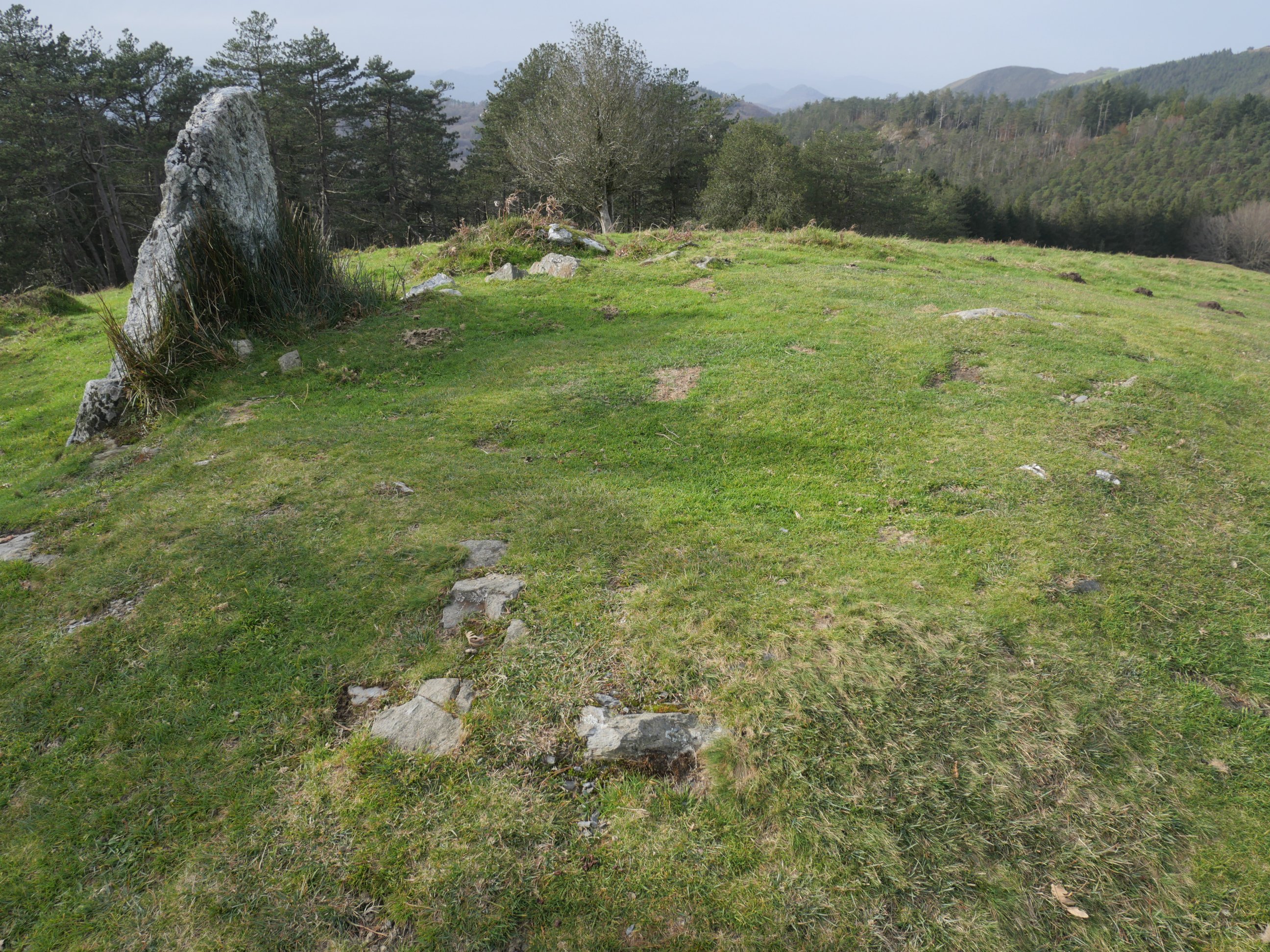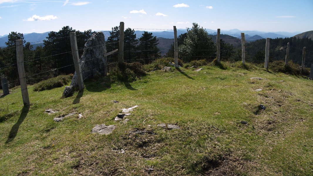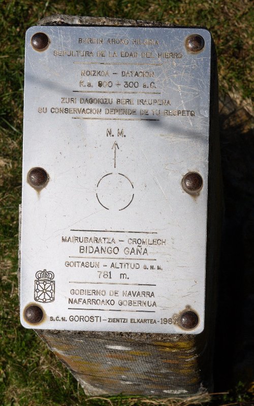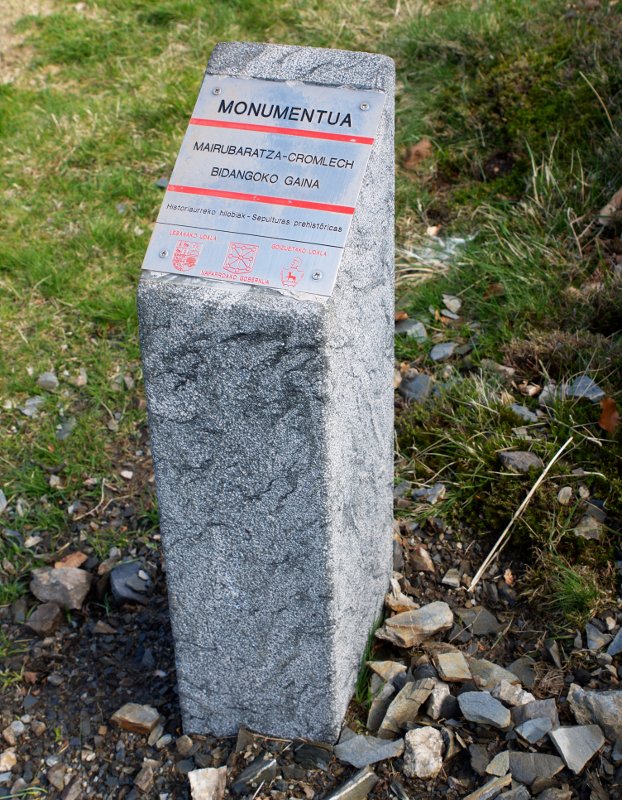 Cromlech tumular (Fig.7). 4.50 m. de diámetro N.-S. y E.-W., compuesto por numerosos pequeños bloques (probablemente debido al destrozo del yacimiento por el camino y rodadas de vehículos todo terreno que pasan por encima del mismo) que apenas destacan del terreno y un gran bloque de cuarcita situado en el arco meridional, con forma de losa triangular de 1.50 m. de altura, entre 1.50 m. y 0.25 m. de ancho y entre 0.35 m. y 0.25 m. de grueso, Orientación del eje mayor, E.-W. En la cara septentrional (al interior del recinto) contiene grabado el abáculon de la antigua Colegiata de Roncesvalles. Túmulo rebajado formado por pequeños bloques y tierra. Materiales del conjunto, cuarcita, granito y pizarras del terreno.