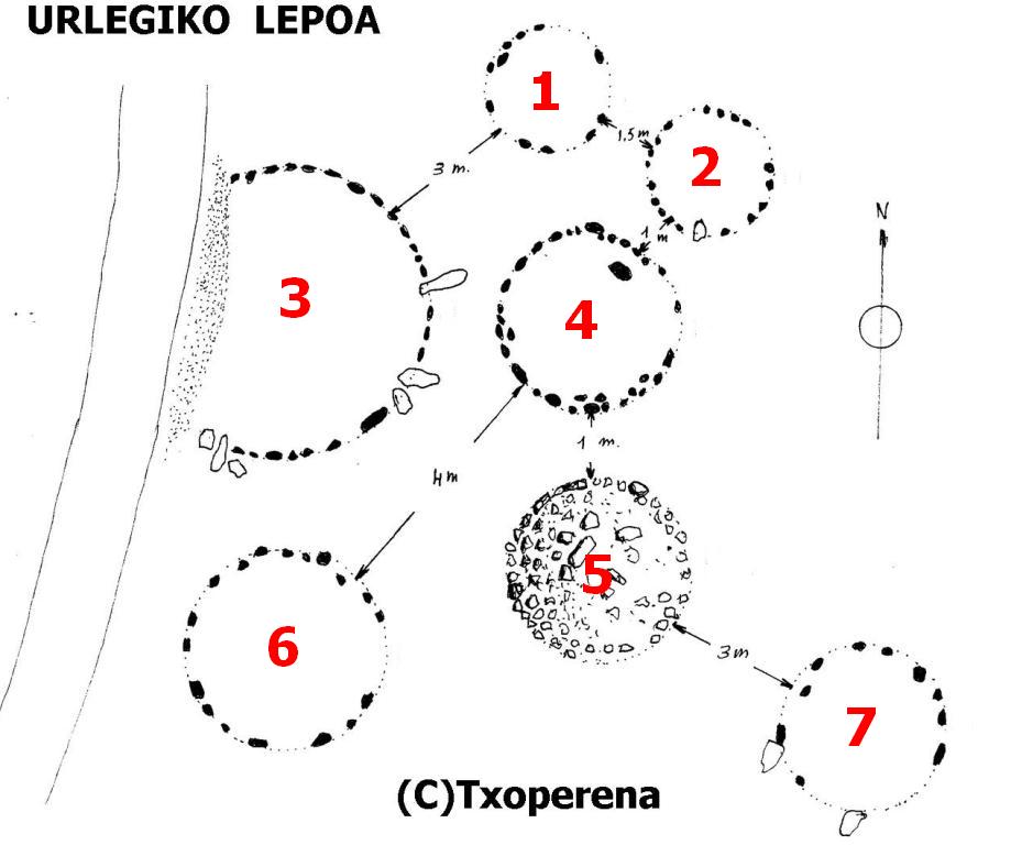 URLEGI zutarria (63 m.ra) · URLEGIKO BIZKARRA harrespila (143 m.ra) · URLEGI tumulua (148 m.ra) · ESKOSKO zutarria (422 m.ra) · ZIMIZTA harrespila (438 m.ra) · ZIMIZTA harrespila (506 m.ra) · LARRAKAGAINA harrespila (542 m.ra) · AIZALEGI tumulua (851 m.ra) · AIZALEGI harrespila (959 m.ra) ·