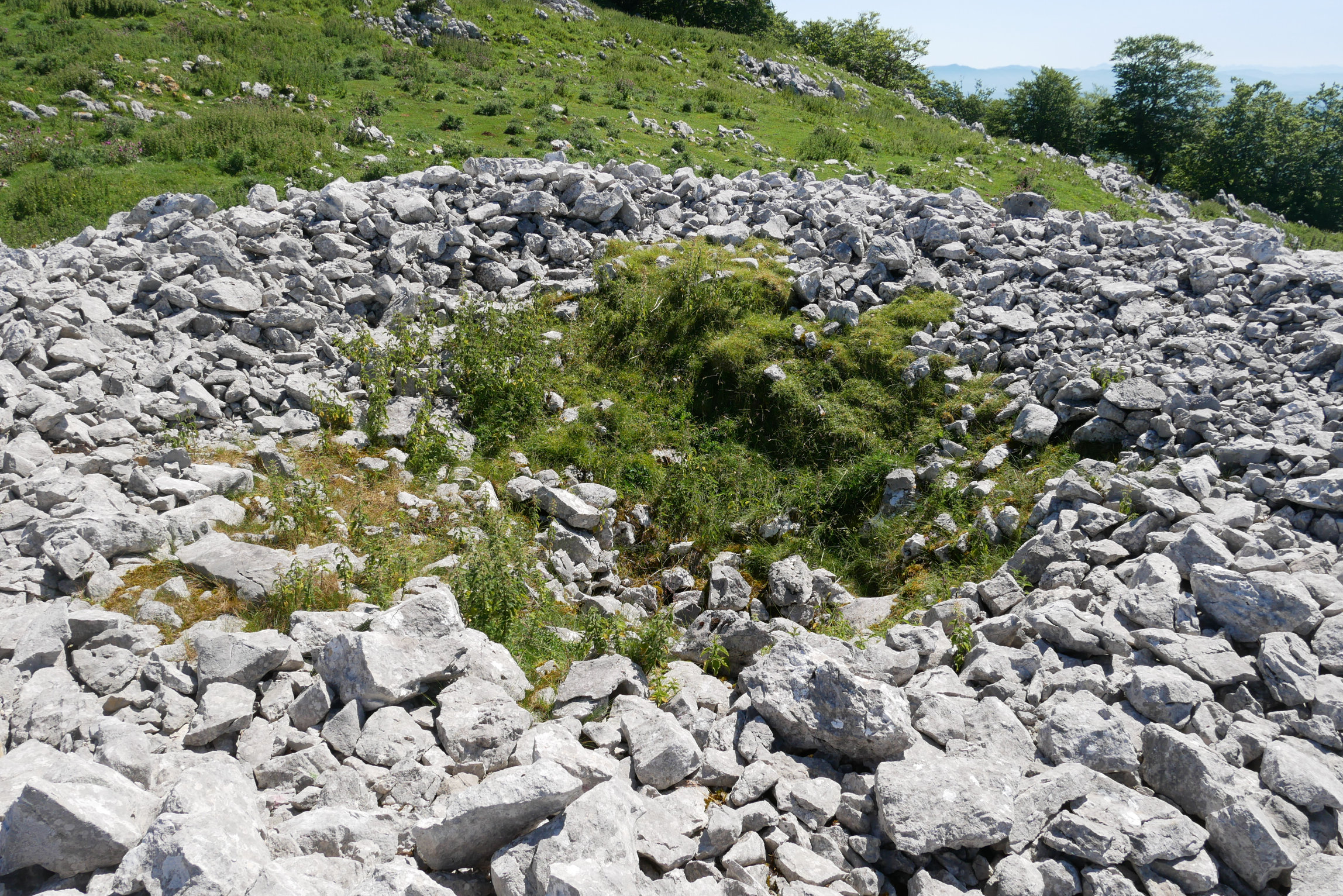 Hoy día el monumento se reduce a un extenso galgal de cantos calizos de unos 15 m. de diámetro en cuyo centro existe un hoyo de 4 m. de diámetro en el que, en un tiempo, existió sin duda un dolmen del que no queda hoy el menor vestigio (fig. 1). Los más viejos pastores que frecuentan actualmente estos parajes de Aralar han conocido siempre el galgal en la disposición que hoy presenta. Son numerosas las txabolas de pastores (Olatxiki, Palleti, Urdanota, Irulizarreta, Alborta, Neguri-sarobe, etc.) que rodean al monumento en un círculo de corto radio. Por lo que no tendría nada de extraordinario que, como ha sido observado por Barandiarán en alguna otra ocasión, las losas laterales y tapa del Dolmen de Mukuru-ko arri-pilla, debidamente fraccionadas, sean hoy elementos constructivos de alguna txabola pastoril.