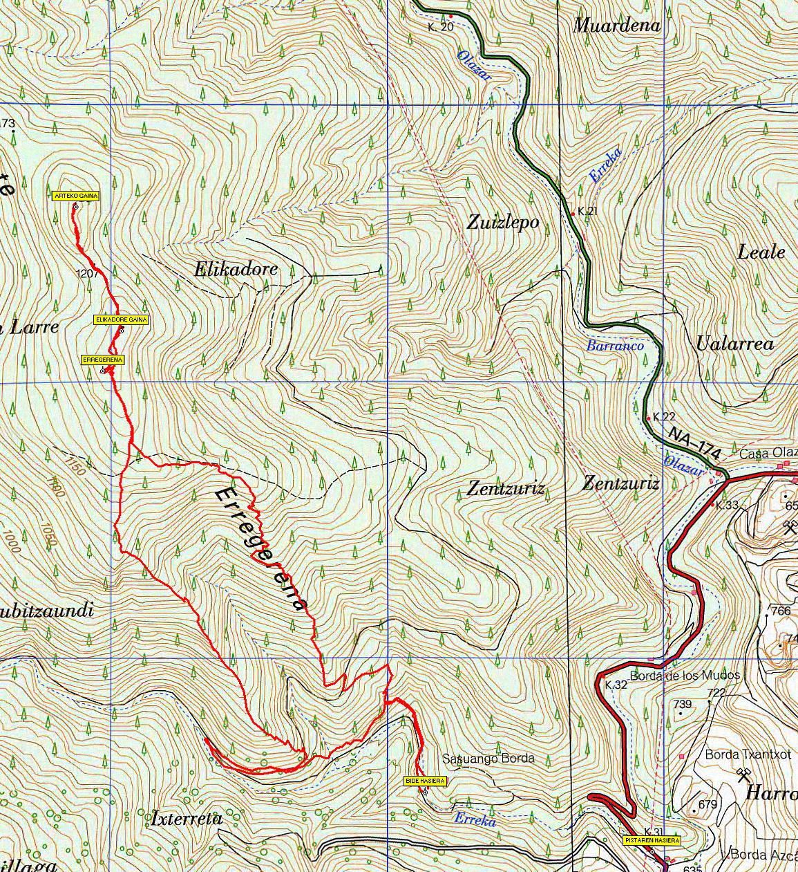 Eugiko harrobien sarrera baino 50 bat metroren aurrean hasten den pista asfaltatuan hasiko dugu gure ibilbidea. Pistak ipar-mendebalderantz egiten du. Autoz egin genitzake lehenbiziko berrehun bat metroak, debeku karteleraino. Bertan autoa utzi eta pistan gora jarraituko dugu. Zubi txiki bat pasata, eskuin aldean pista bat pagadian sartzen ikusiko dugu. Lurrezko pista horrek sigi-saga eramanen gaitu mendian gora. Luze gabe, pista zurira aterako gara berriz ere. Metro batzuk eskuinetara eginda, bide bat ikusiko dugu ezkerretara, pagadian sartzen. Bide hori hartu eta gora jarraituko dugu mendiaren ertzeraino -ikus mapa-. Bidea utzi eta ertz horretan gora eginen dugu. Hasieran bidexka estu bati jarraituko diogu, baina gora egin ahala, hori ere galdu eta biderik gabe gora egiten jarraituko dugu. Iparreari eutsiko diogu uneoro, eta mendiaren ertzari ere, alboetara desbideratu gabe. Altuerako 1150 metroen aldean, bide zabalago batekin eginen dugu topo, usategien dorrez dorre dabilena. Bideari mendebalderantz jarraituko diogu. Bideak zuzenean mendiaren gailurrera eramanen gaitu. Mugarri pare bat ikusiko ditugu bertan. Hogei bat metro mendebalderago, harkaitz batzuk daude, nondik paisaia apur batez gozatzeko aukera izanen baitugu.