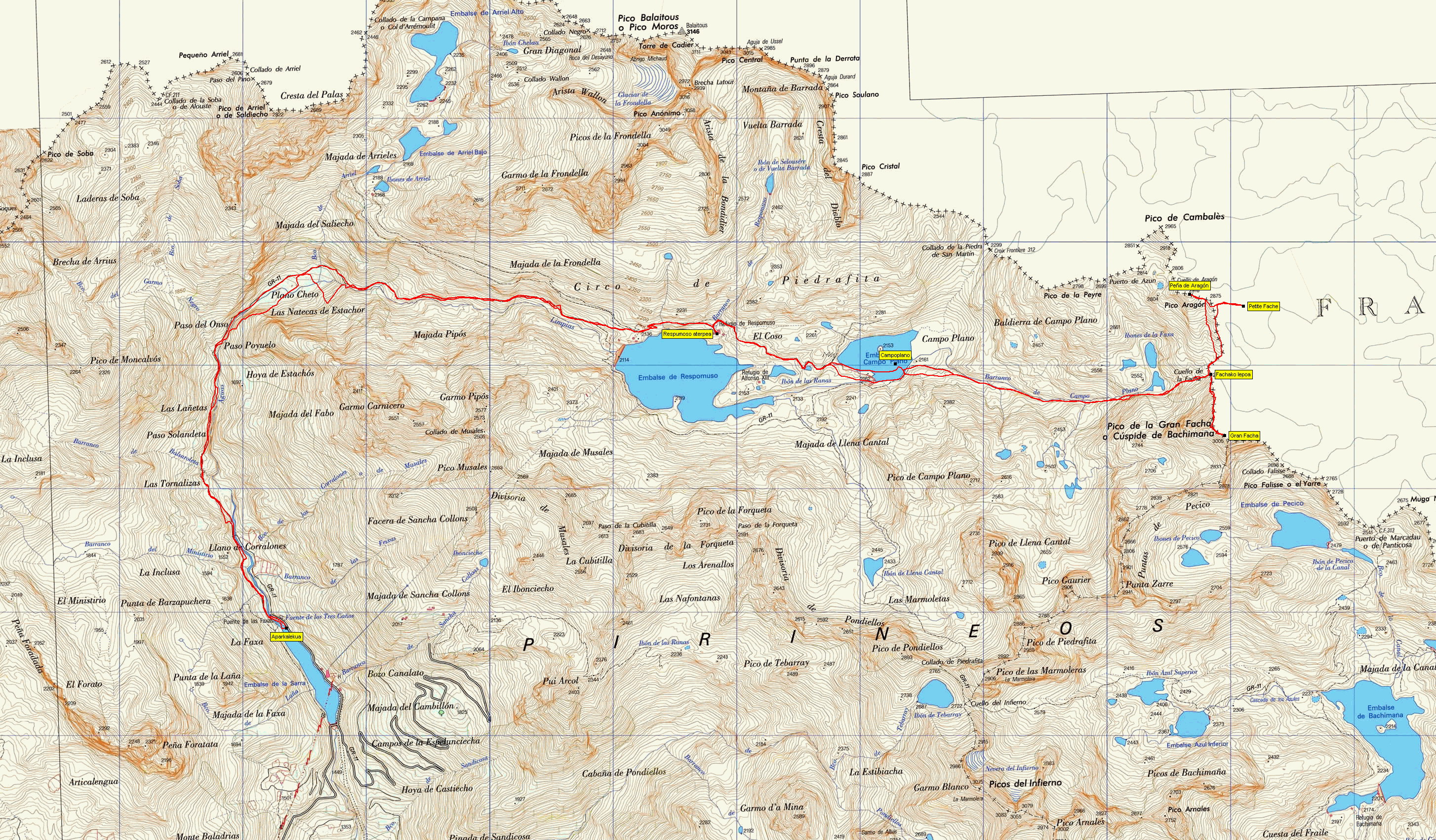 La Sarra urtegia – Respumoso aterpea – Fachako lepoa – Gran Facha – Fachako lepoa – Peña de Aragón – Petite Fache – Fachako lepoa – Respumoso aterpea – La Sarra urtegia