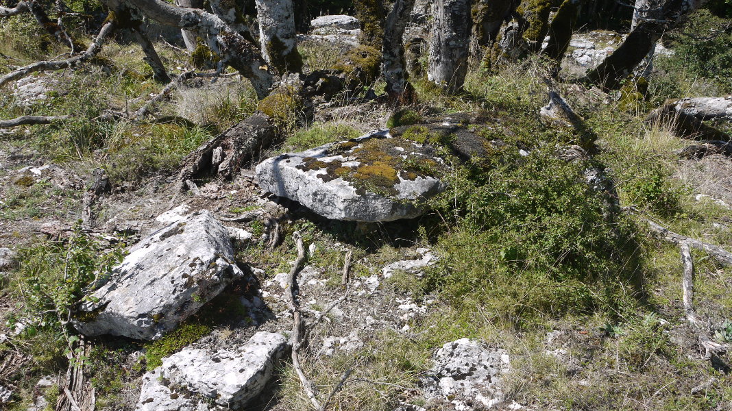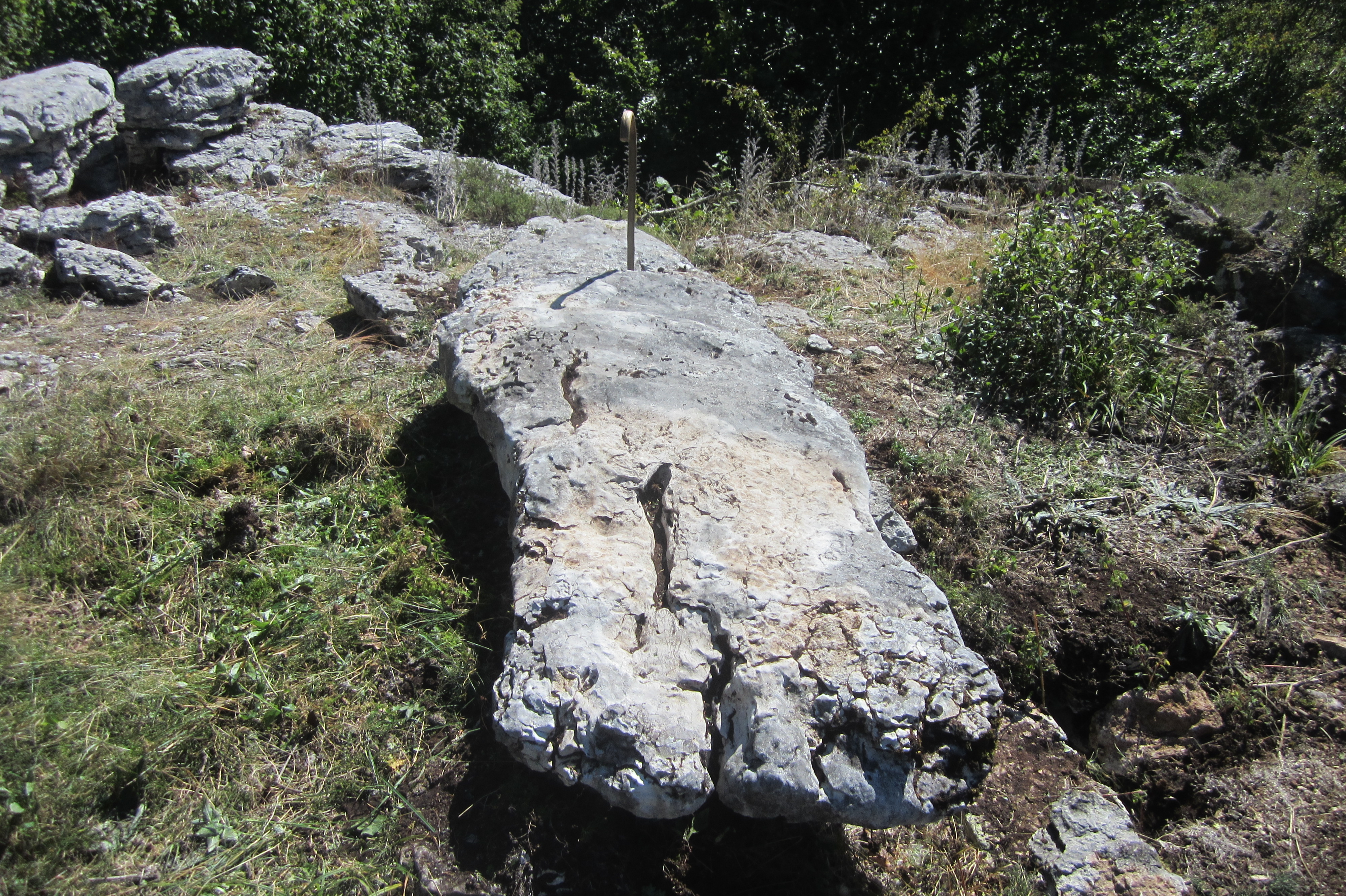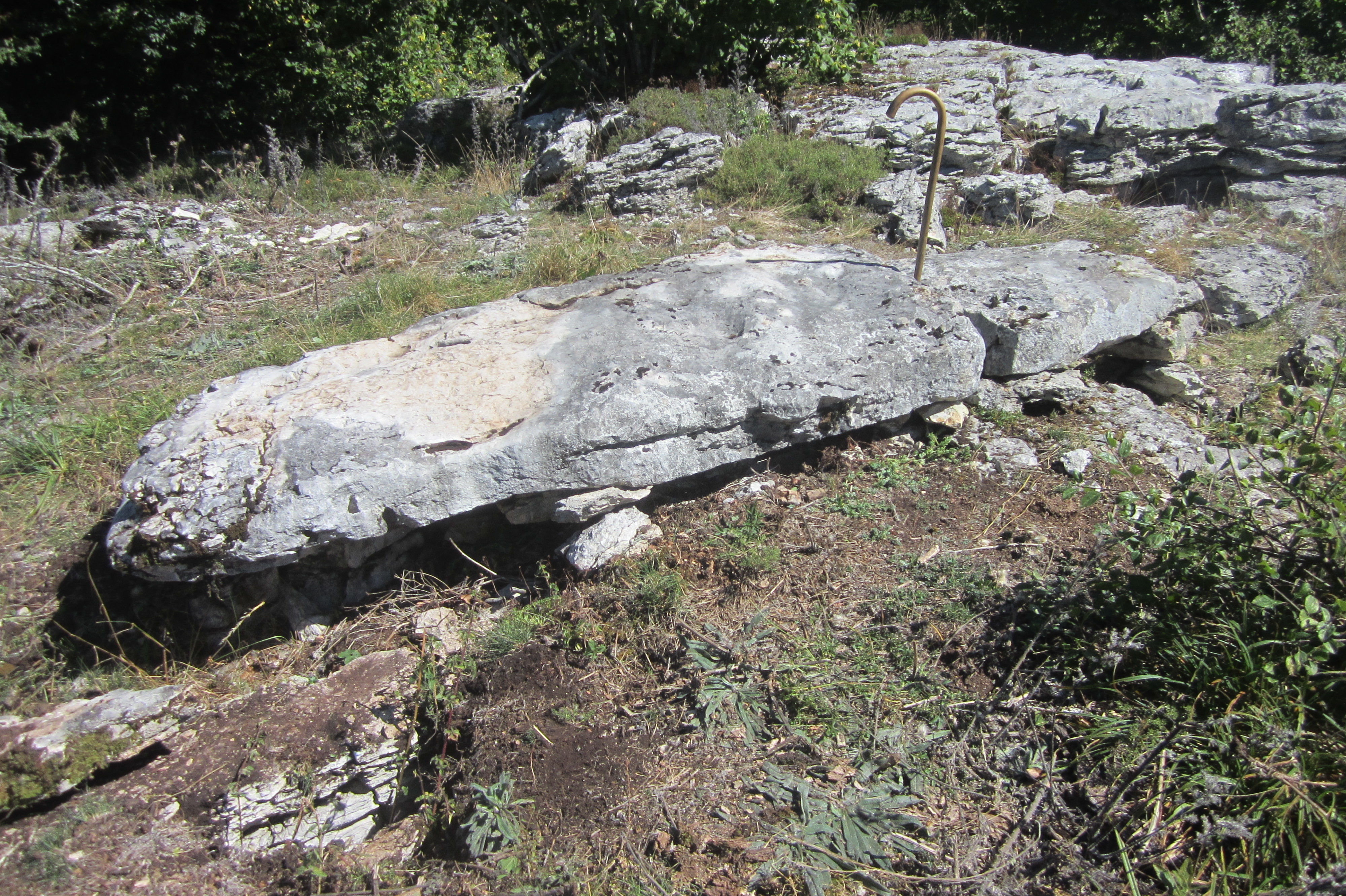 Bizkar harritsu baten erdian dagoen harlauza haundia, 2.50x80 inguru, lurrean etzanda eta bitan puskatuta. Harri asko dago inguruan, harri haundi xamarrak ere bai, baina honek ez du dagoen lekukoa ematen, eta itxura definitua du oso. Bada bere oinean zutik egon zitekeeneko zulo antzeko bat, baina ez naiz zuloa arakatzen ausartu.