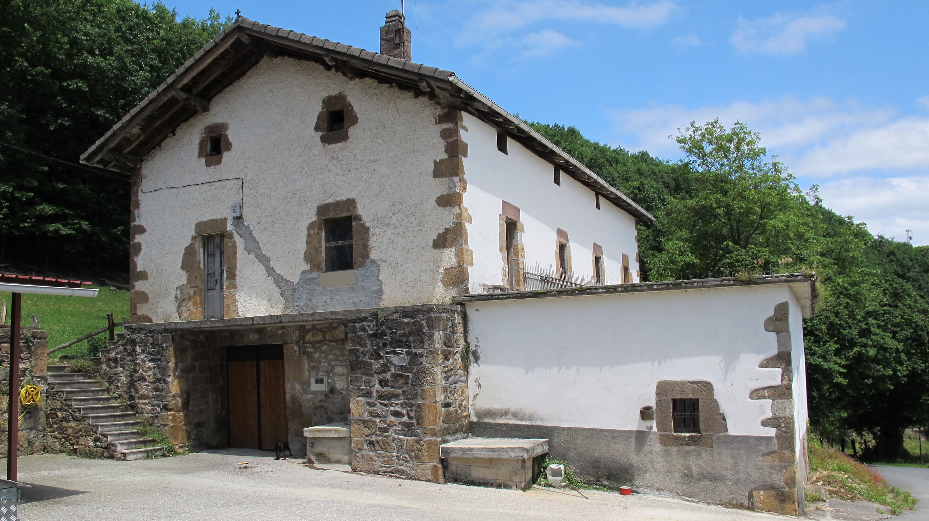 "a poca distancia del núcleo en dirección a Donamaría", "Está situada a un kilómetro del pueblo en su parte más baja, adosada por el oeste a una casa que llaman venta. Se halla presidida por las imágenes de San Miguel y San Antonio." dio Catálogo Monumentalak.