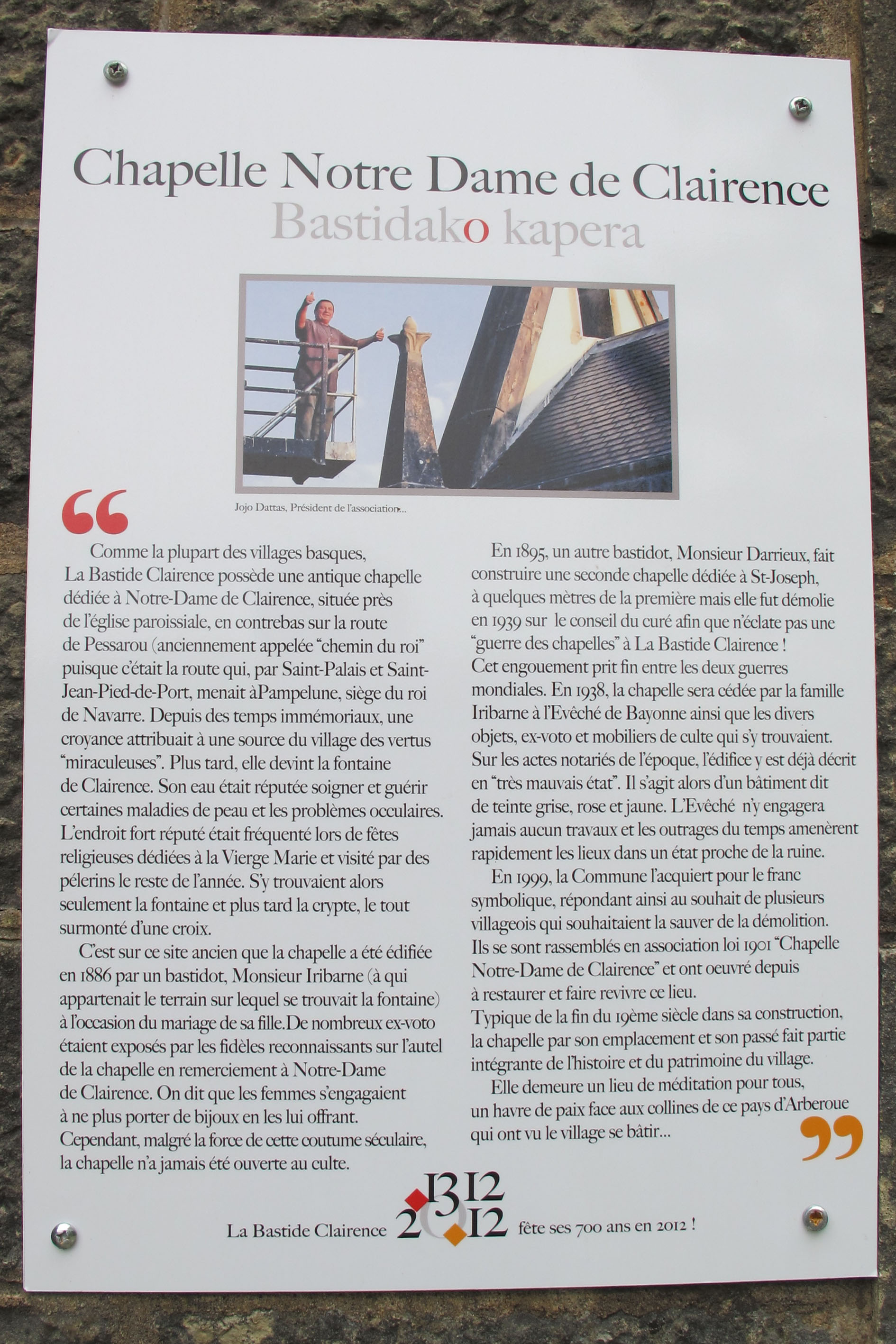Bastidako Kapera, Bastida ©Xirikando (20130508) aspect_ratio896 klik Mota:ErmitaBeste izenak: Chapelle Notre Dame de Clairence Lurraldea:BastidaIraupen egoera: Nahiko ona IruzkinakKomentariorik ez..Gertuko helburuakBastida udalerria (268 m.ra) · Beste mapatan ikusi Google MapsSITNAWaypoints 1·tik 10·ra, 10 guztira infoplaceBastidako Kapera, Bastida ©XirikandoinfoplaceBastidako Kapera, Bastida ©XirikandoinfoplaceBastidako Kapera, Bastida ©XirikandoinfoplaceBastidako Kapera, Bastida ©XirikandoinfoplaceBastidako Kapera, Bastida ©XirikandoinfoplaceBastidako Kapera, Bastida ©XirikandoinfoplaceBastidako Kapera, Bastida ©XirikandoinfoplaceBastidako Kapera, Bastida ©XirikandoinfoplaceBastidako Kapera, Bastida ©XirikandoinfoplaceBastidako Kapera, Bastida ©Xirikando