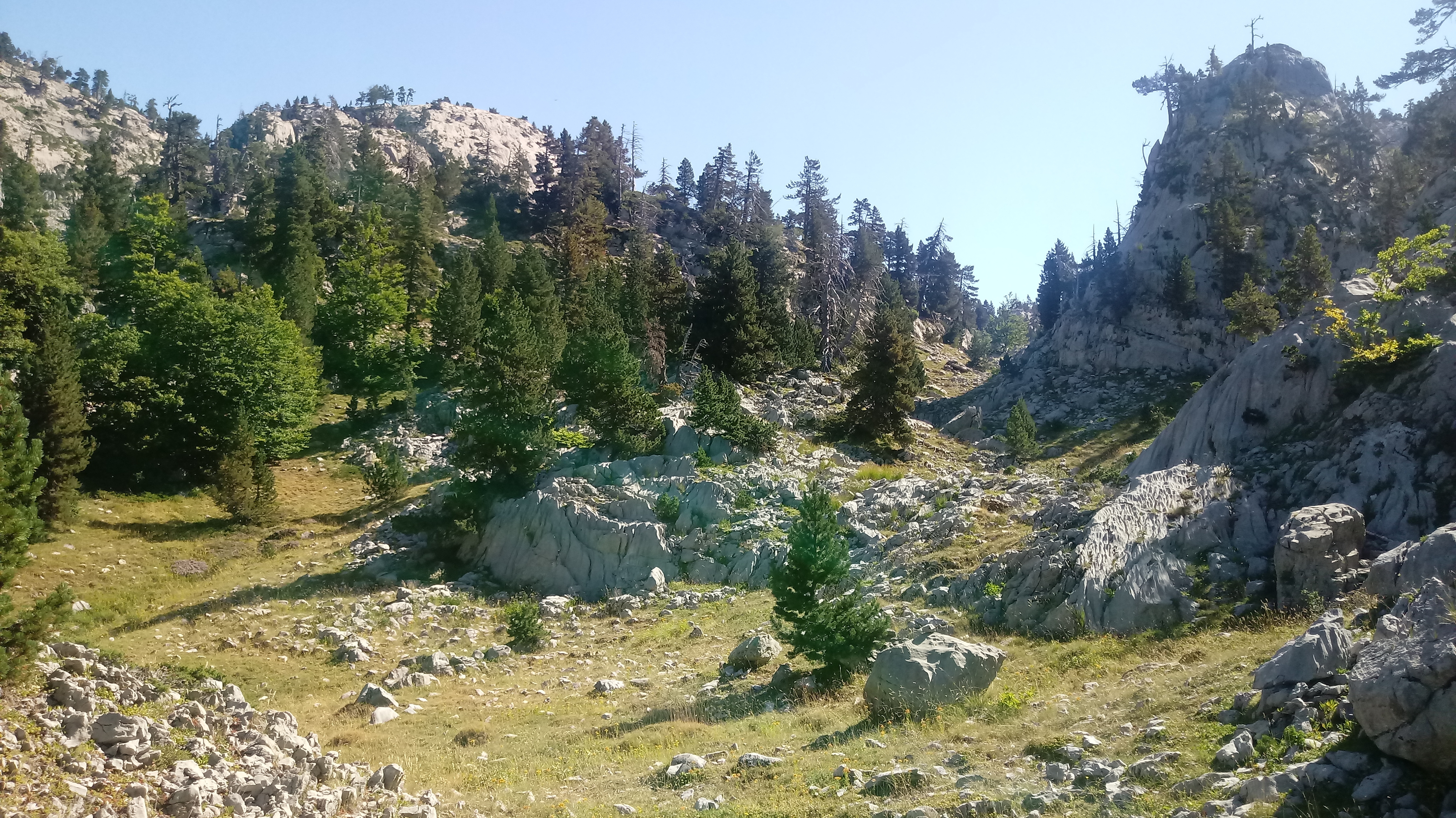 Itzulera bidea egiteko, ez nuen bide zailegirik nahi edo ahal, eta Larrako Ateak-ko sakongunera jeitsi nintzen. Hasieran harri artetik ibili behar da Ukerdiko lepoaren inguruan baina gero senda oso nabarmena dago belardian behera. Bertatik Lintzolaren magalean zehar GR12 bidezidorra jarraituz senda errazean Larreriako Lepoa Ekialdeara jeisteko.