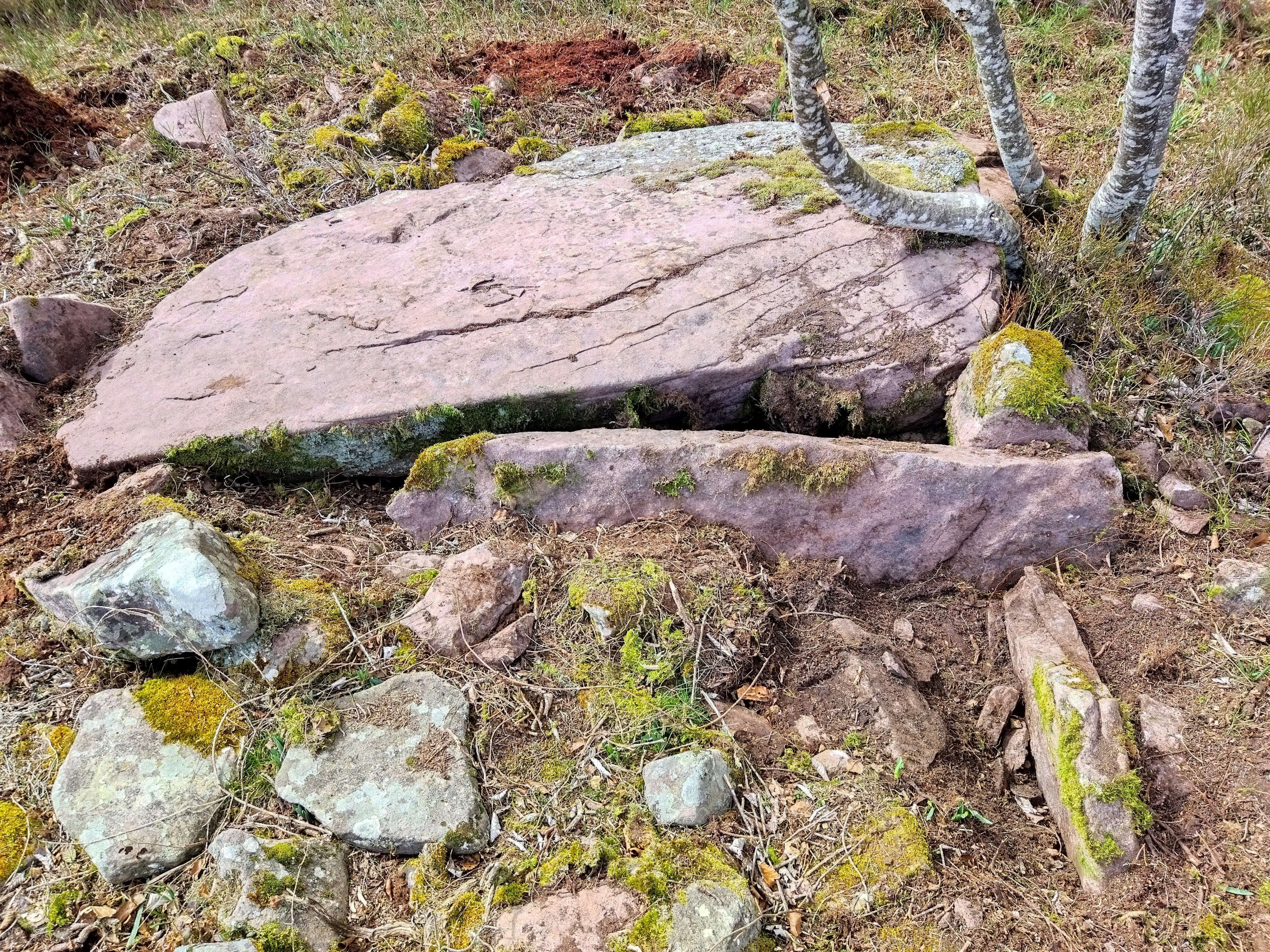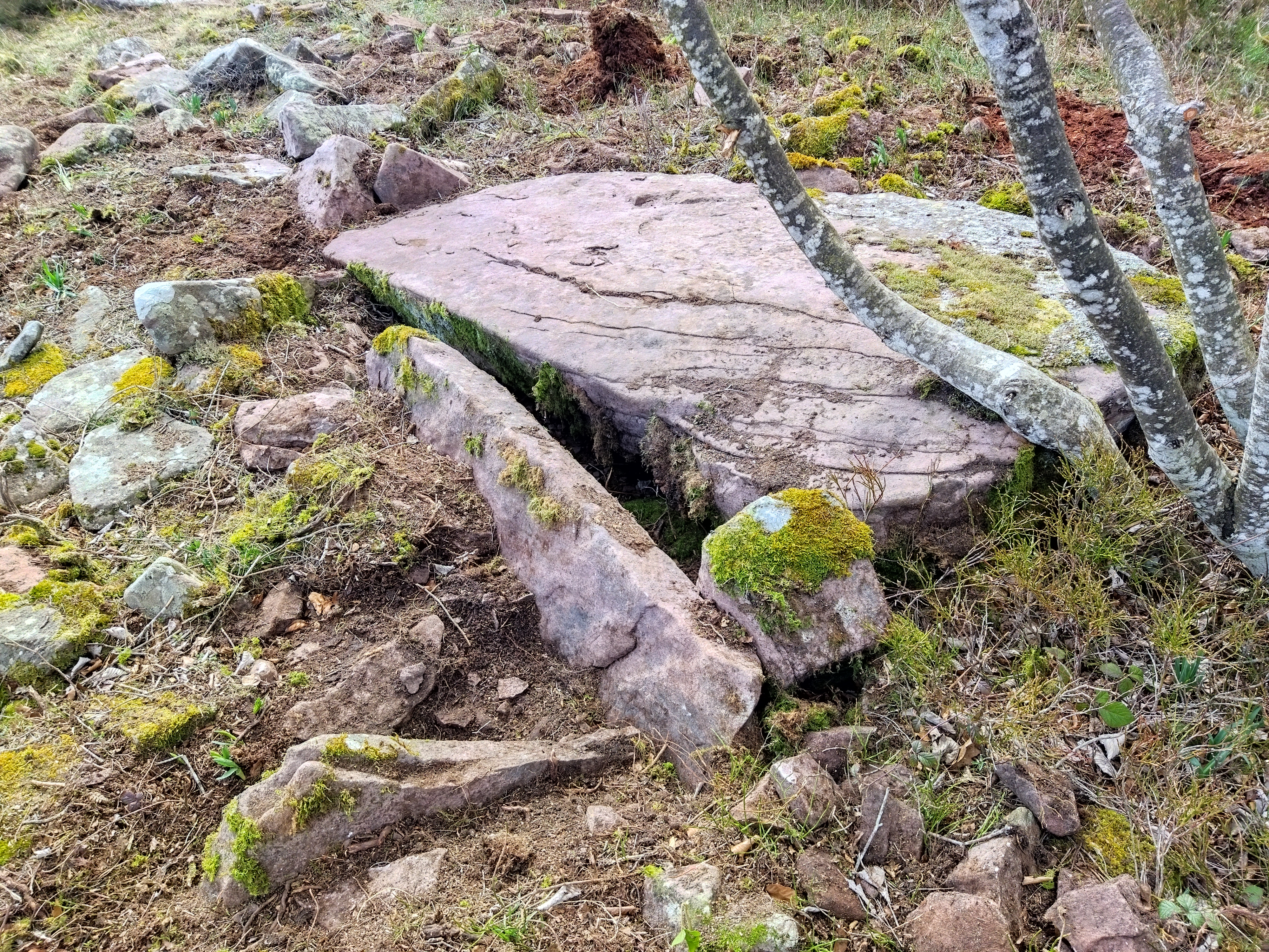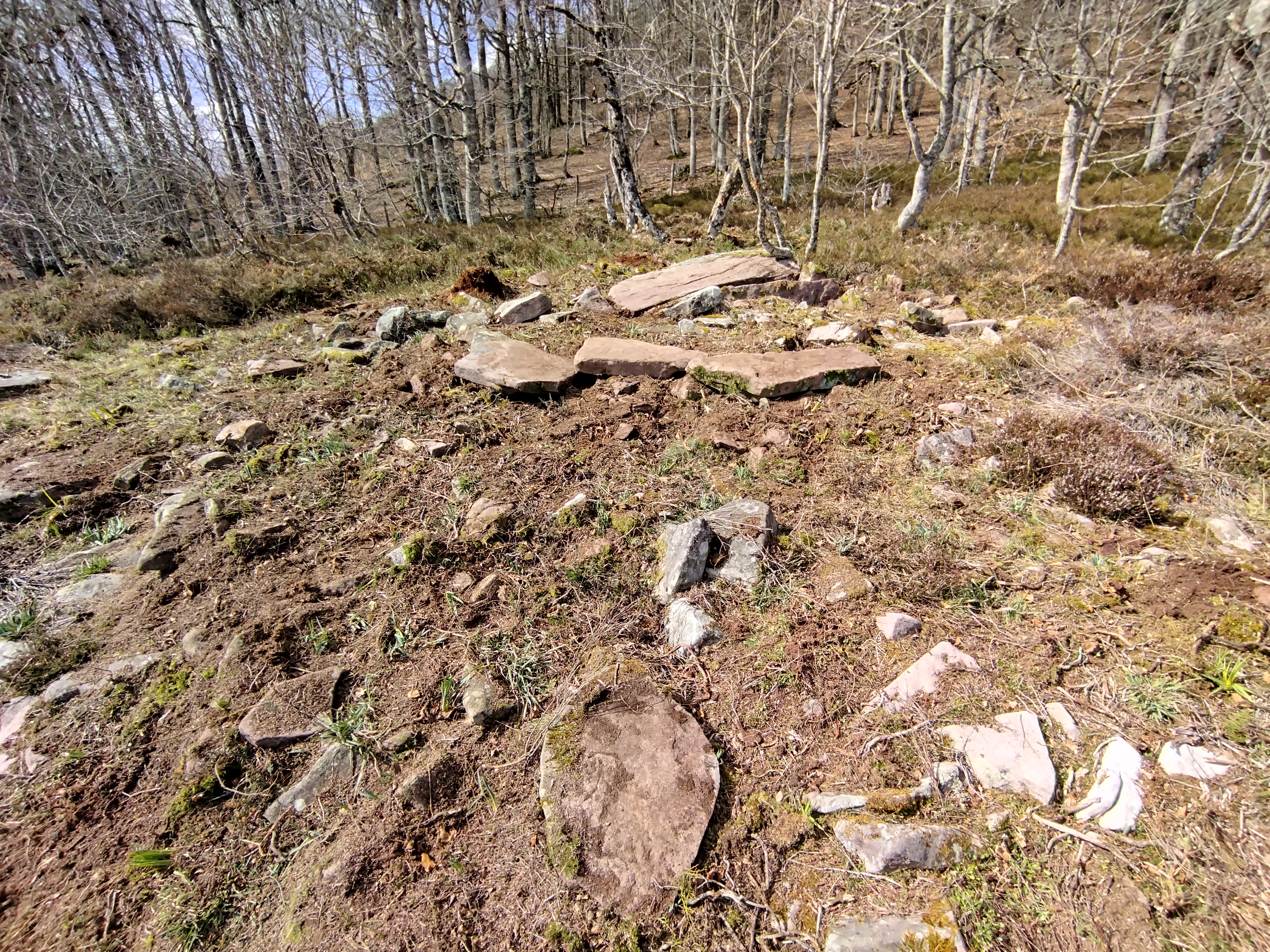 Tumuluaren erdialdean bi harlauza ageri dira eskuairan eta haien alboan estalkia. Tumuluaren gainean beste harlauza batzuk etzanda agertzen dira.