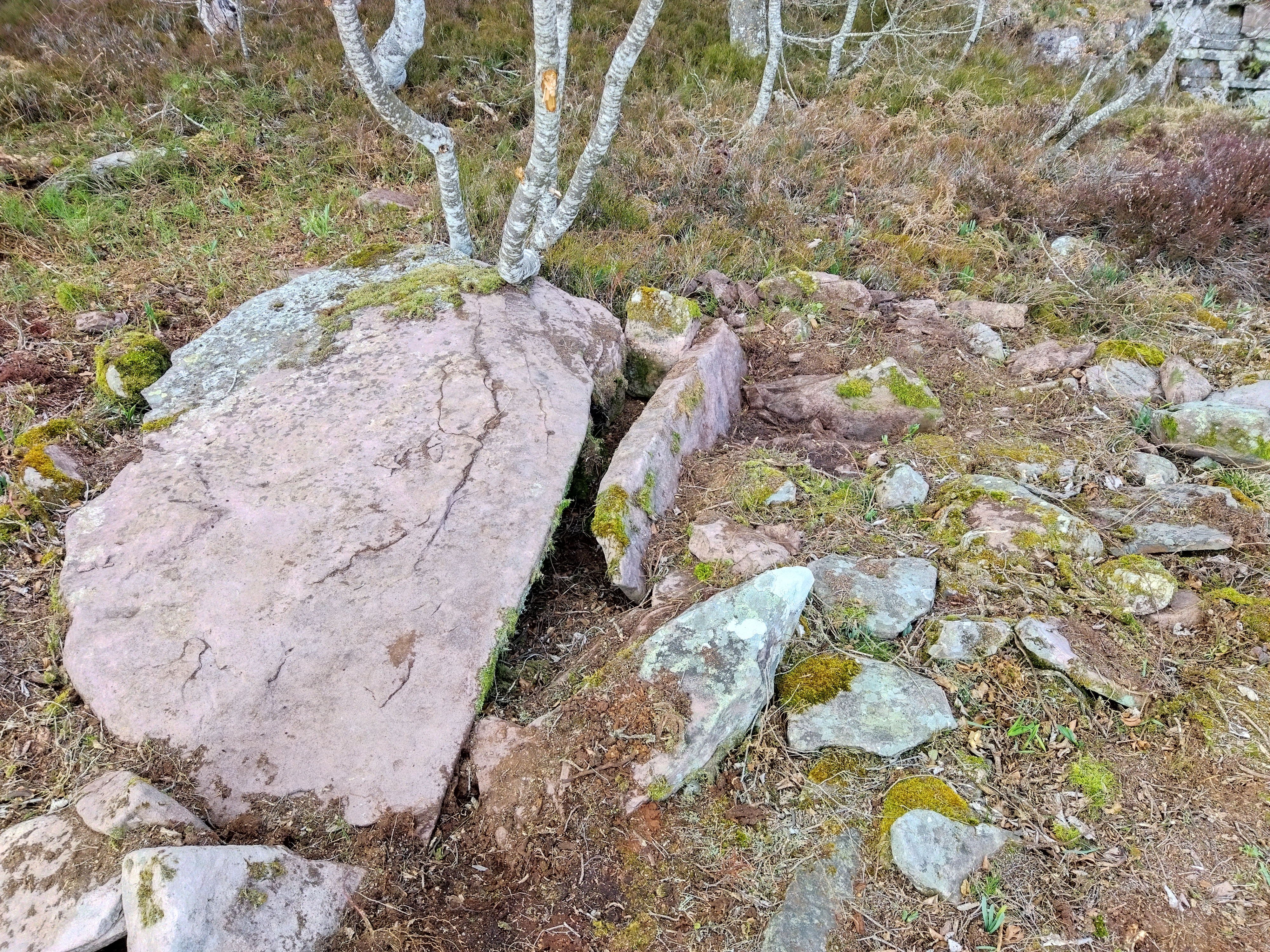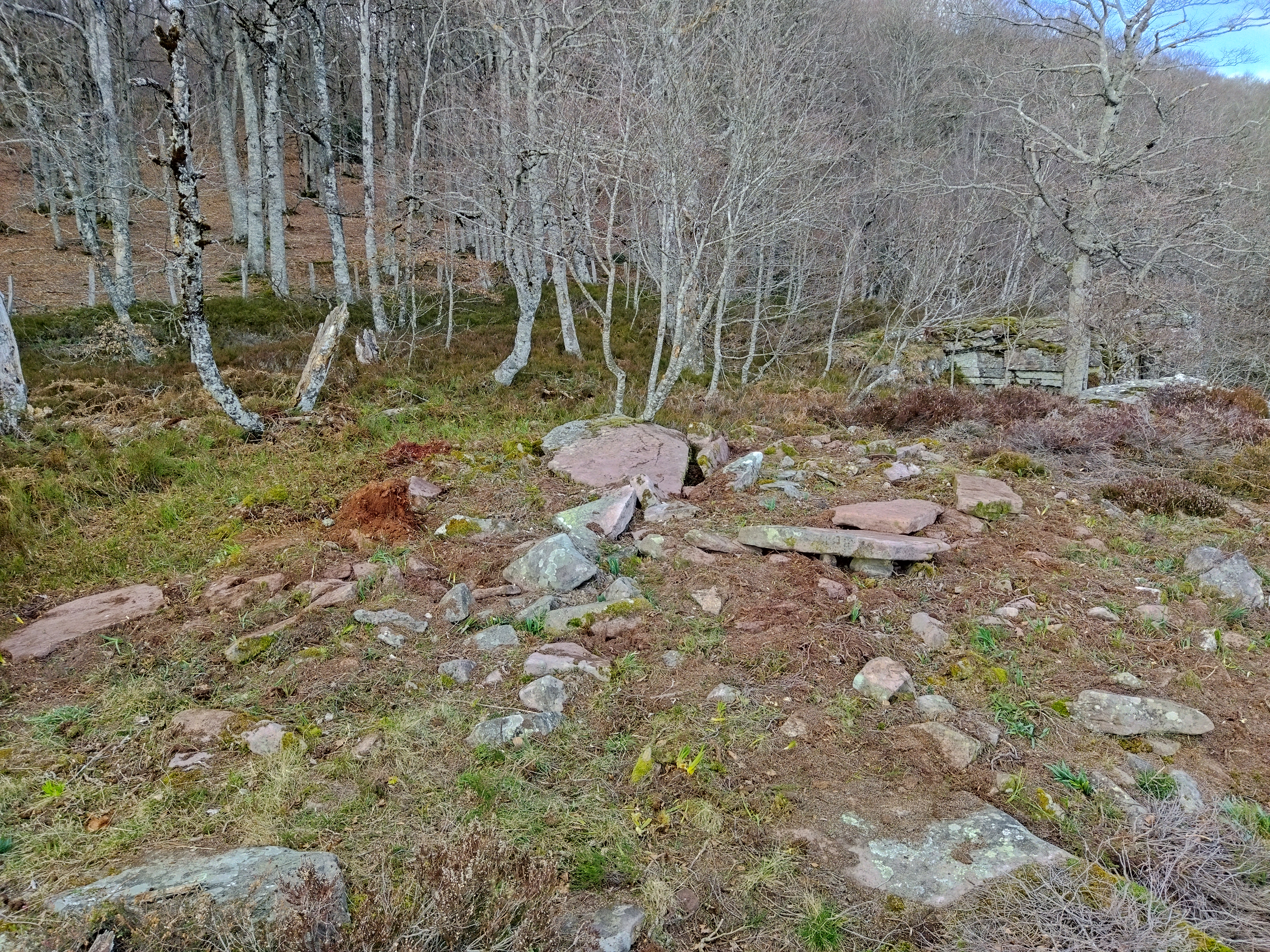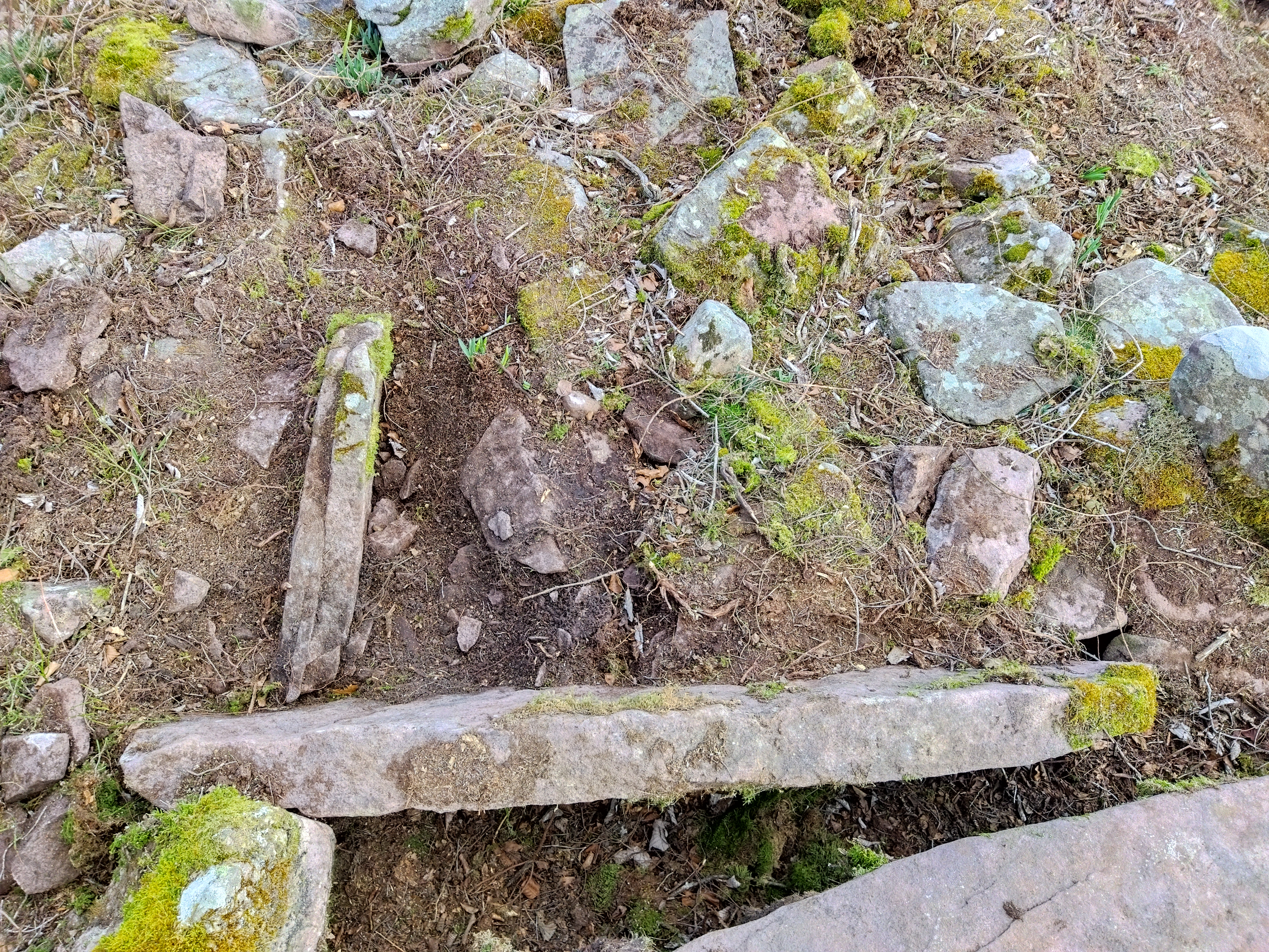 Tumuluaren erdialdean bi harlauza ageri dira eskuairan eta haien alboan estalkia. Tumuluaren gainean beste harlauza batzuk etzanda agertzen dira.