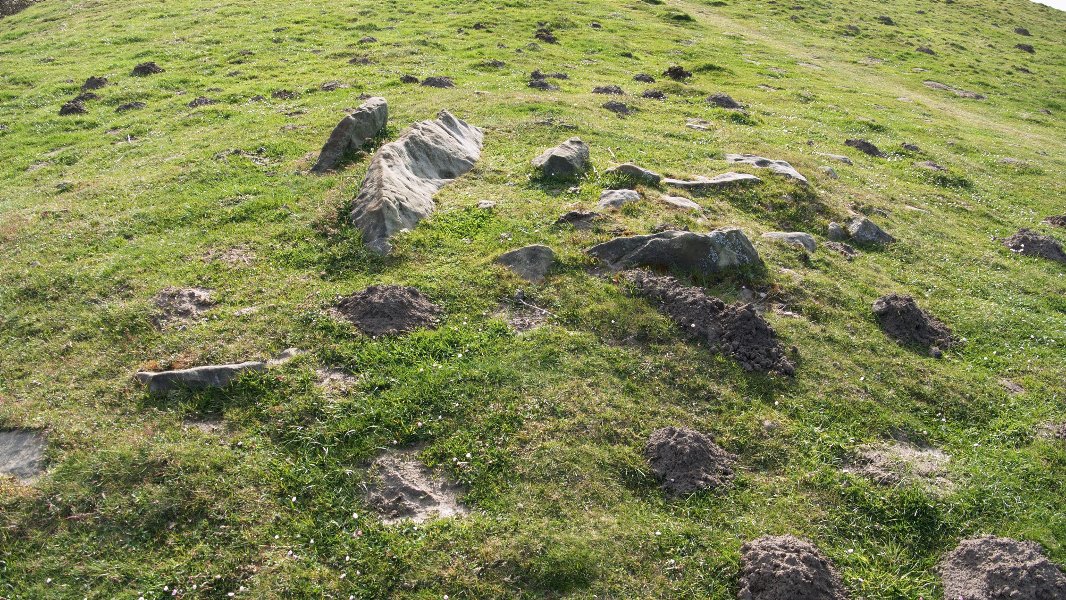 Trikuharria. Tumulu jeitsia, 5 m. diametrokoa I-H eta 5,40 m. E-M, 0,35 m.tako altuera duelarik. Ganbara, kontserbatzen den tumulu zatiaren erdian dago, eta bata bestearekin paralelo dauden bi harlosek (80ºtako norabidean), barnekalderantz okertuak, 0,20 m. azaltzen direnak, eratzen dute. Bertako hareharriak.