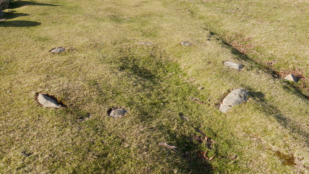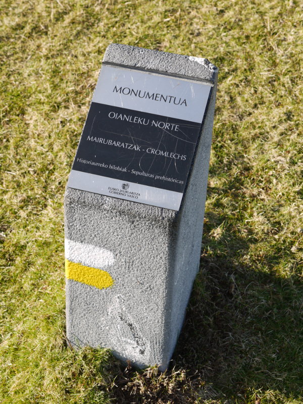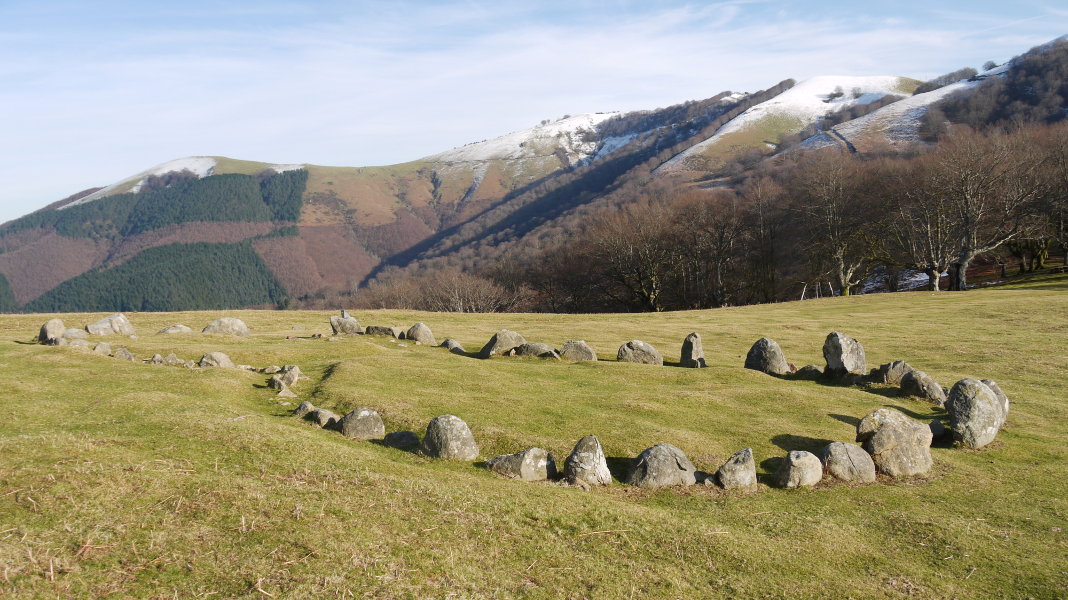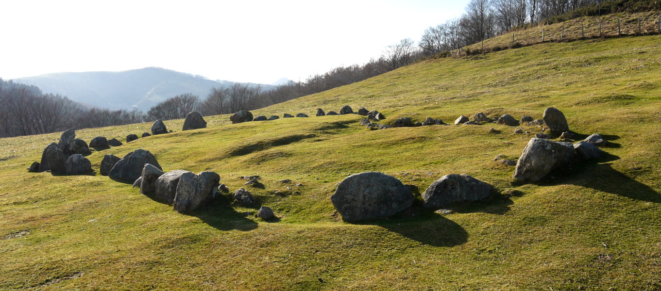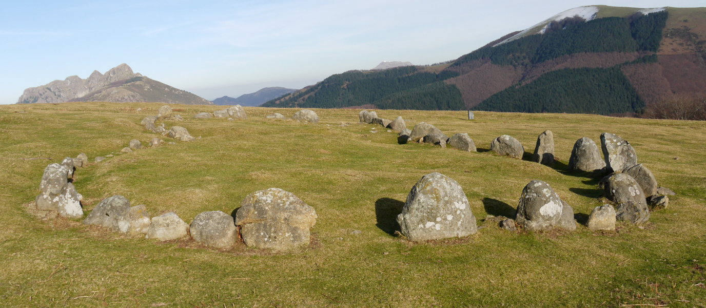 1-2.- Bi zirkulu sekantez antolatutako egitura konposatua. 1.k 9,50 m.tako diametroa du eta 29 lekukoz, 1 eta 0,10 m. tarteko altuerakoak, osatua dago. 2.k 6,80 m.tako diametroa du eta 18 lekukok, 0,40 eta 0,10 m. tarteko altuerakoak, osatzen dute. Bi zirkuluak mozten diren tokian ez dago lekukorik, beste lekukoen antzeko harkoskoz eraturiko hormatxo baizik.